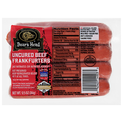 Crafted from an original family recipe, Boar's Head® Uncured Beef Frankfurters are made with USDA Choice Beef and select seasonings for an exceptional flavor and a superior bite.