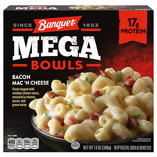 Banquet Mega Bowls Bacon Mac and Cheese frozen meal brings exciting flavor to your table. Featuring pasta spirals and smoked cheese sauce, topped with mozzarella cheese, bacon and green onions for a delicious frozen dinner with a kick. This frozen macaroni and cheese bowl offers 17g protein per serving to put hunger in its place. Enjoy Banquet Mega Bowls as easy frozen lunches or for quick frozen dinners any day of the week. Preparation of these ready made meals is easy. Just follow the instructions on the box to heat the frozen food in the oven for fresh-baked flavor or in the microwave for quicker cook time. Store the 13 ounce frozen meal in the freezer until you’re ready to enjoy. Banquet Mega delivers hearty meals that will keep bringing you back for more.