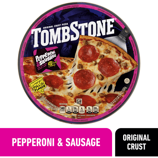 Tombstone Pepperoni and Sausage Pizza is not just another frozen pizza, it's a full-on flavor experience that's sure to steal the spotlight at any pizza party. This freezer pizza is loaded with bold and zesty toppings -- our buttery, crispy crust is smothered in a zesty sauce, covered with gooey real cheese and topped with sausage and pepperoni (sausage and pepperoni made with pork, chicken and beef). Ready in just nineteen minutes, this pepperoni and sausage pizza is the perfect easy dinner for when spontaneous pizza hunger strikes — simply bake it up and enjoy pub-inspired deliciousness right at home. With one of these bad boys in your freezer, you’ll always have a party pizza or frozen dinner ready to go. Born in a bar in 1962, Tombstone has perfected the art of crafting the perfect pepperoni and sausage pizza, making it the go-to choice for an effortless crowd-pleaser.