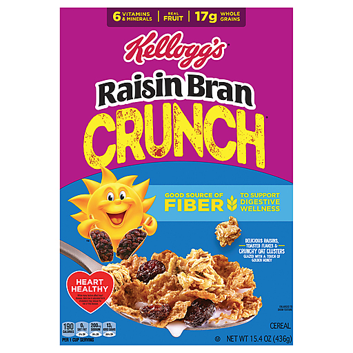 Have a bowl of get up and go with the delicious taste of Kellogg's Raisin Bran Crunch, a delicately crafted, wholesome breakfast cereal that helps bring energy to start your day. This satisfyingly crunchy cereal is made with delicious sun-ripened raisins, toasted flakes and crunchy oat clusters glazed with a touch of honey in every spoonful. Kellogg's Raisin Bran Crunch provides 6 key nutrients from real fruit and grains and a good source of fiber to help you start your day off strong; Just as nutritious as it is delicious, this cereal is heart-healthy (while many factors affect heart disease, diets low in saturated fat and cholesterol may reduce the risk of heart disease). With each spoonful, enjoy a sweet and satisfying crunch. Whether you enjoy this healthy cereal in a bowl with your favorite milk for a quick breakfast, sprinkled over yogurt for an afternoon treat, or as a snack straight from the box, Kellogg's Raisin Bran Crunch cereal lets you rise, shine, and make the most of your day.