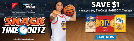 Grab your game day greats for the ultimate game night with NABISCO crackers. Make delicious recipes like RITZ Parmesan Sweet Potato Crisps and WHEAT THINS Creamy Fiesta Taco Dip for the whole crew to enjoy! Scan any cracker pack to enter for a chance to win* a Final Four® Experience, plus bucket loads more prizes. Save now!
